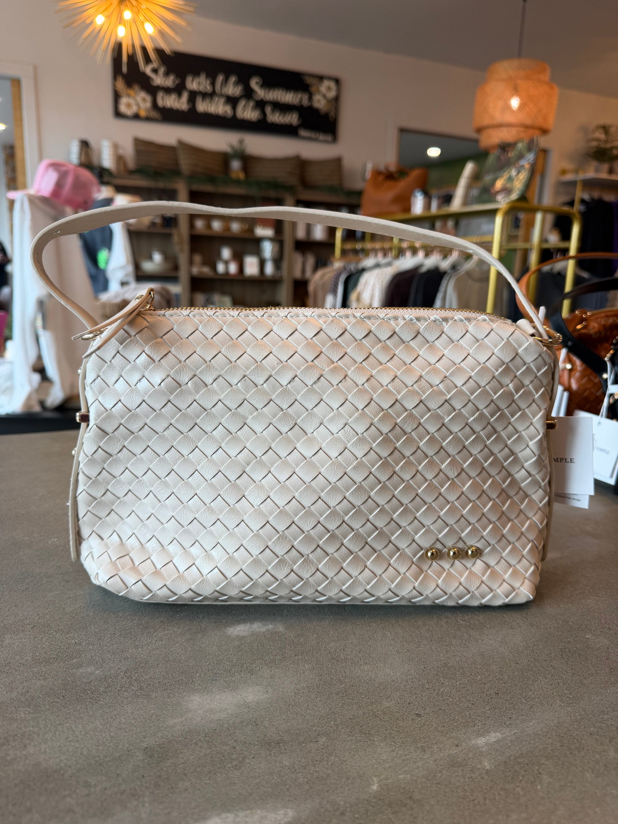 This adorable woven bag features a slouchy look and can be worn as a shoulder, crossbody, or hand bag.