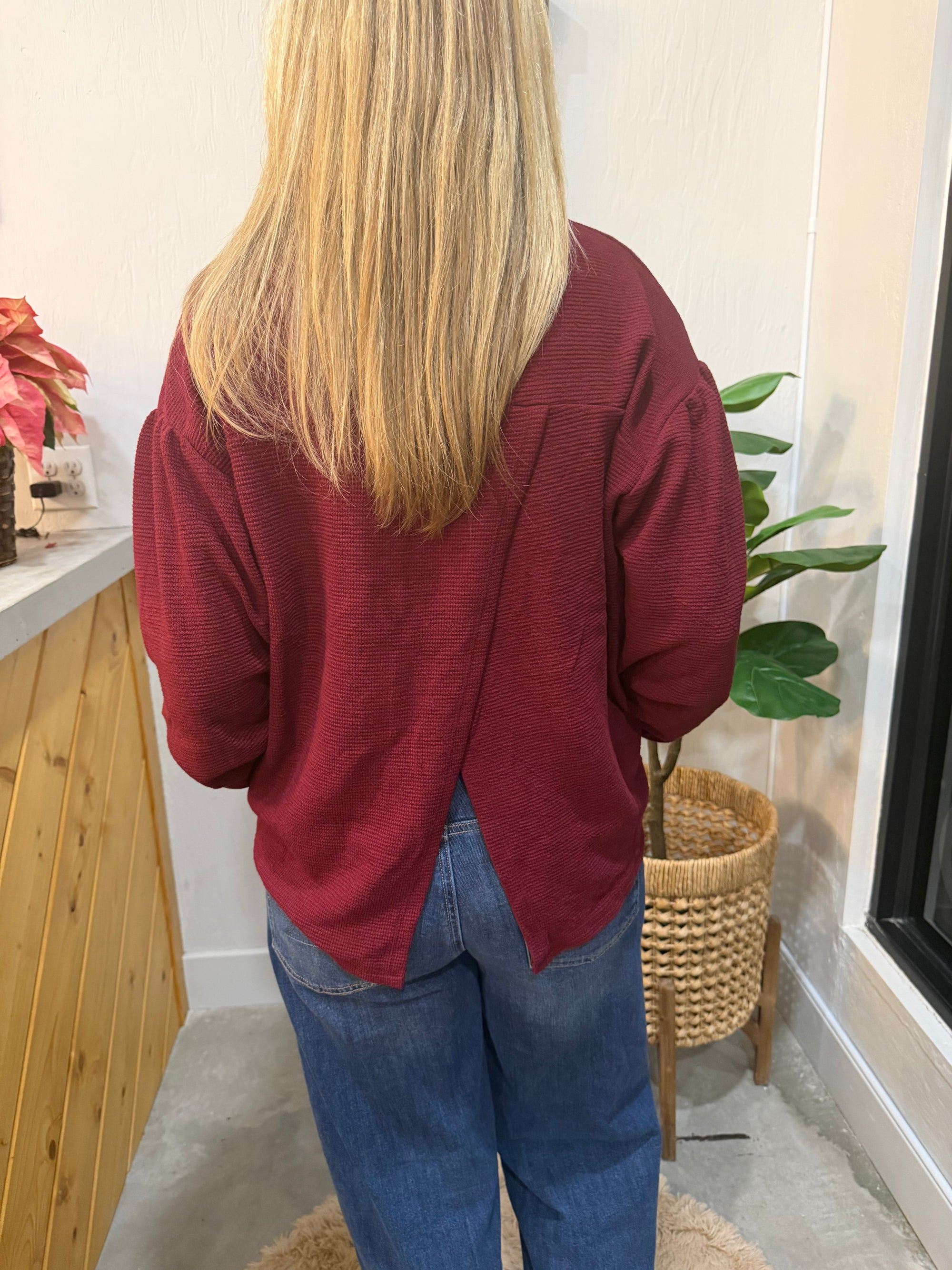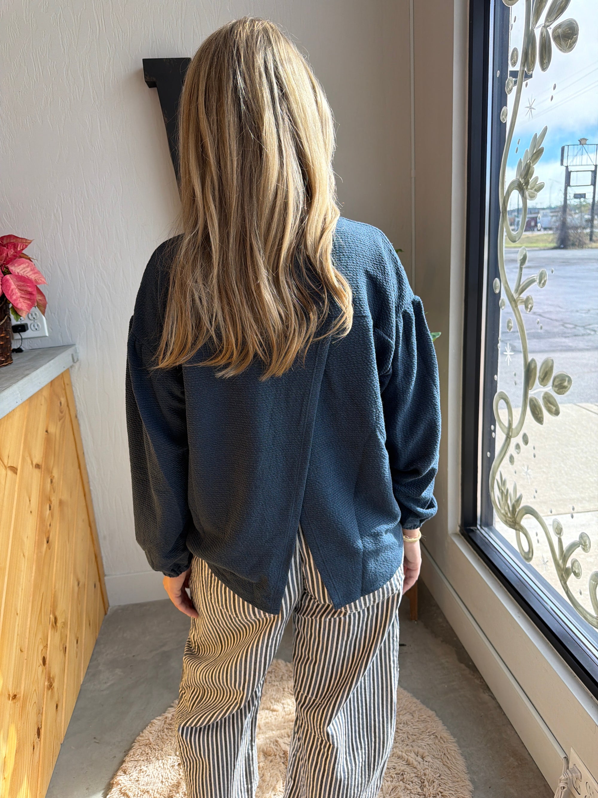 Soft seersucker knit with a relaxed fit and an open-back detail for a subtle twist.