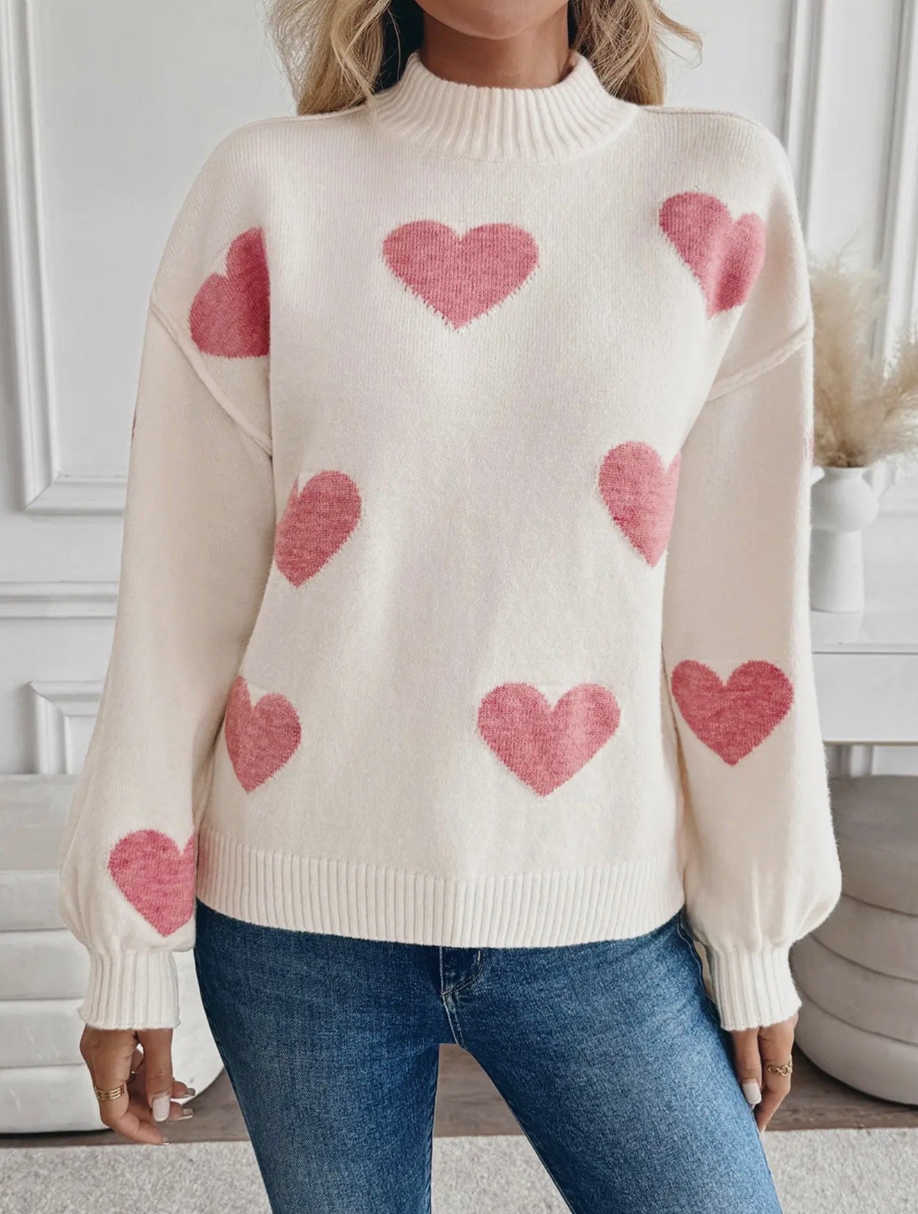 A soft ivory knit sprinkled with rosy heart details, finished with a mock neckline and relaxed sleeves for an effortlessly cute, everyday fit. Perfect for adding a little love to your look.